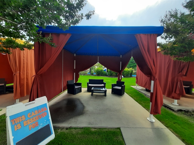 Enjoy upgraded furniture including a small couch and 2 chairs, a table, and curtains for additional shade and privacy. These cabanas are centrally located between the wave pool and the lazy river.